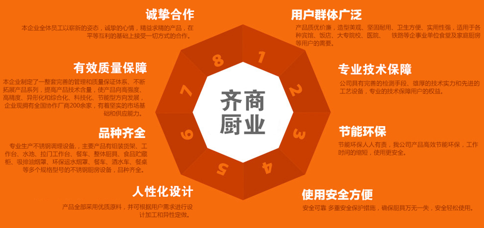 山東省博興縣齊商廚業有限公司是現代化的不銹鋼廚房設備專業企業,具有完善的檢測手段、雄厚的技術實力和精湛的工藝設備及遍布各地的銷售網絡,產品全部采用優質原...
